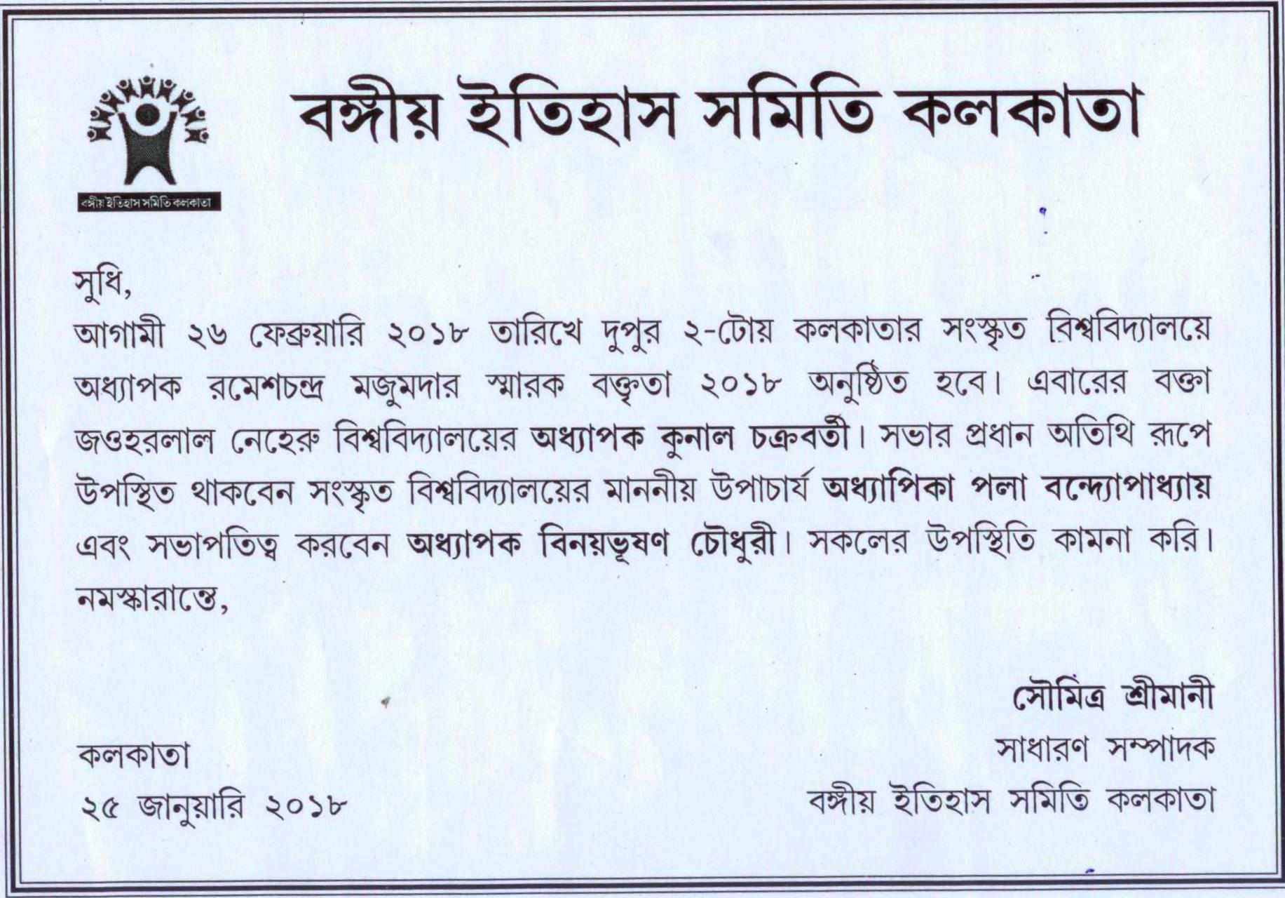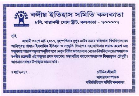 RAMESH CHANDRA MAJUMDER LECTURE ON Ancient Indian History will be delivered by Prof. RANABIR CHAKRA BORTY, Prof. of History, Jawharlal Nehru University, New Delhi scheduled in the late March ,2017