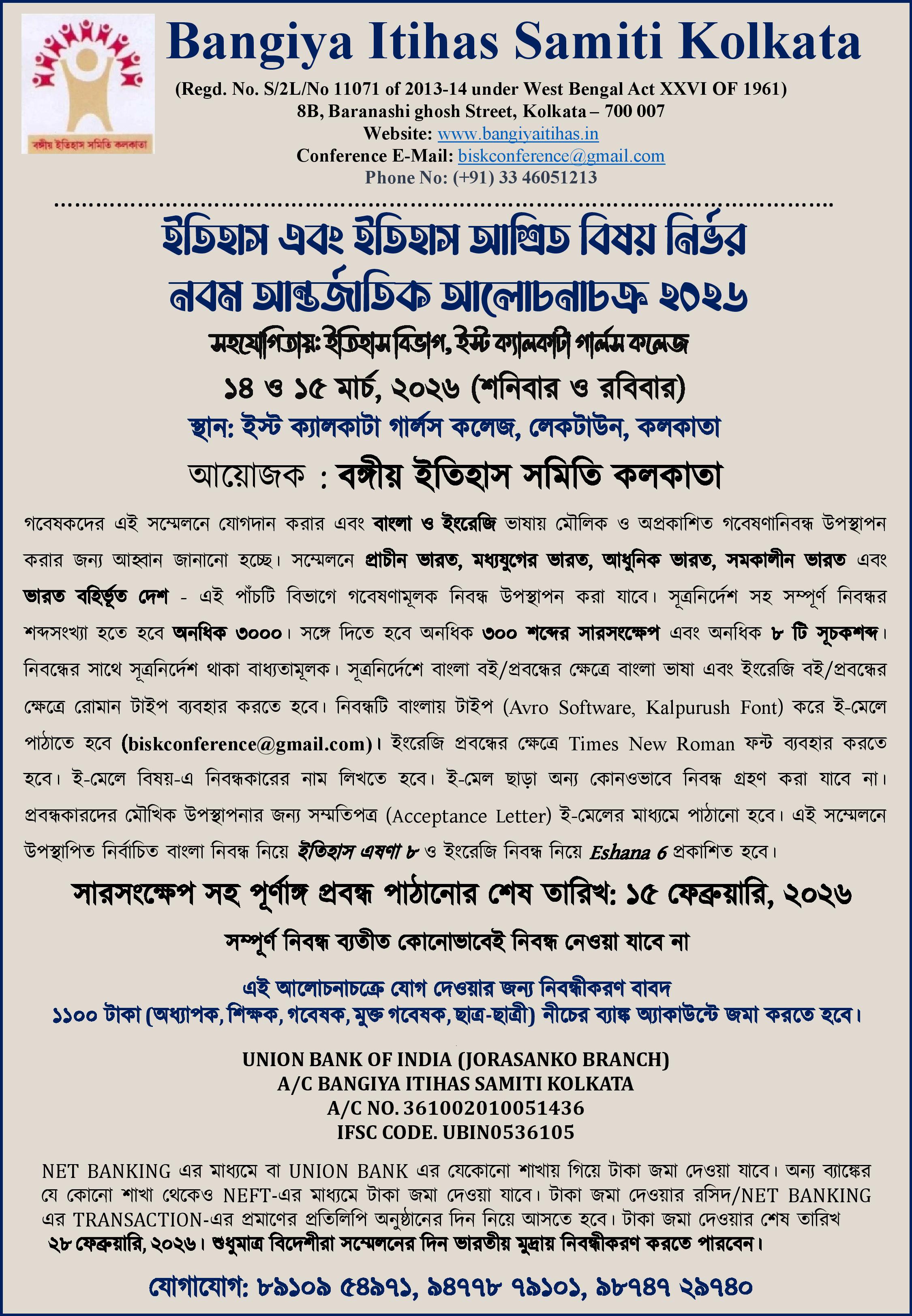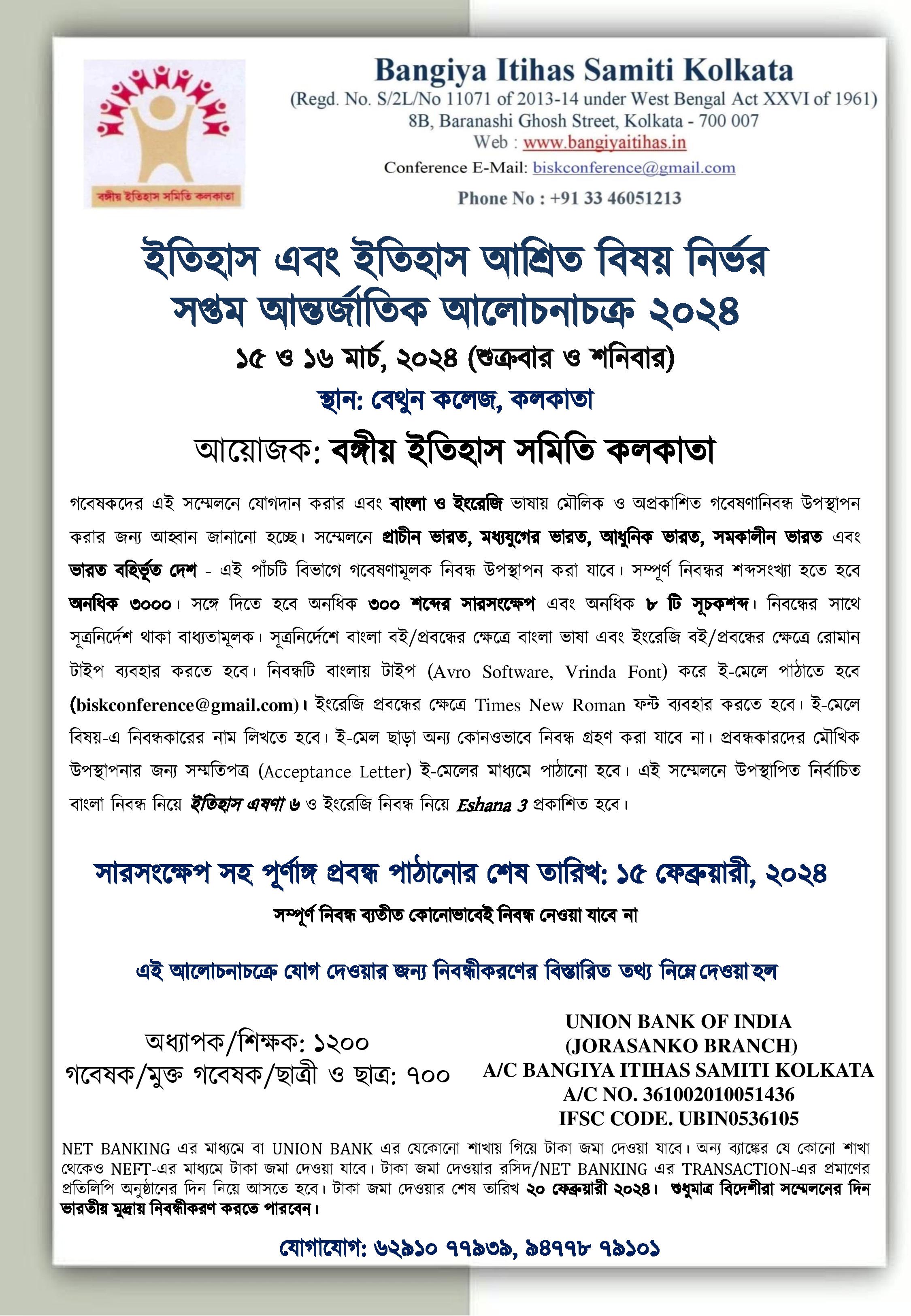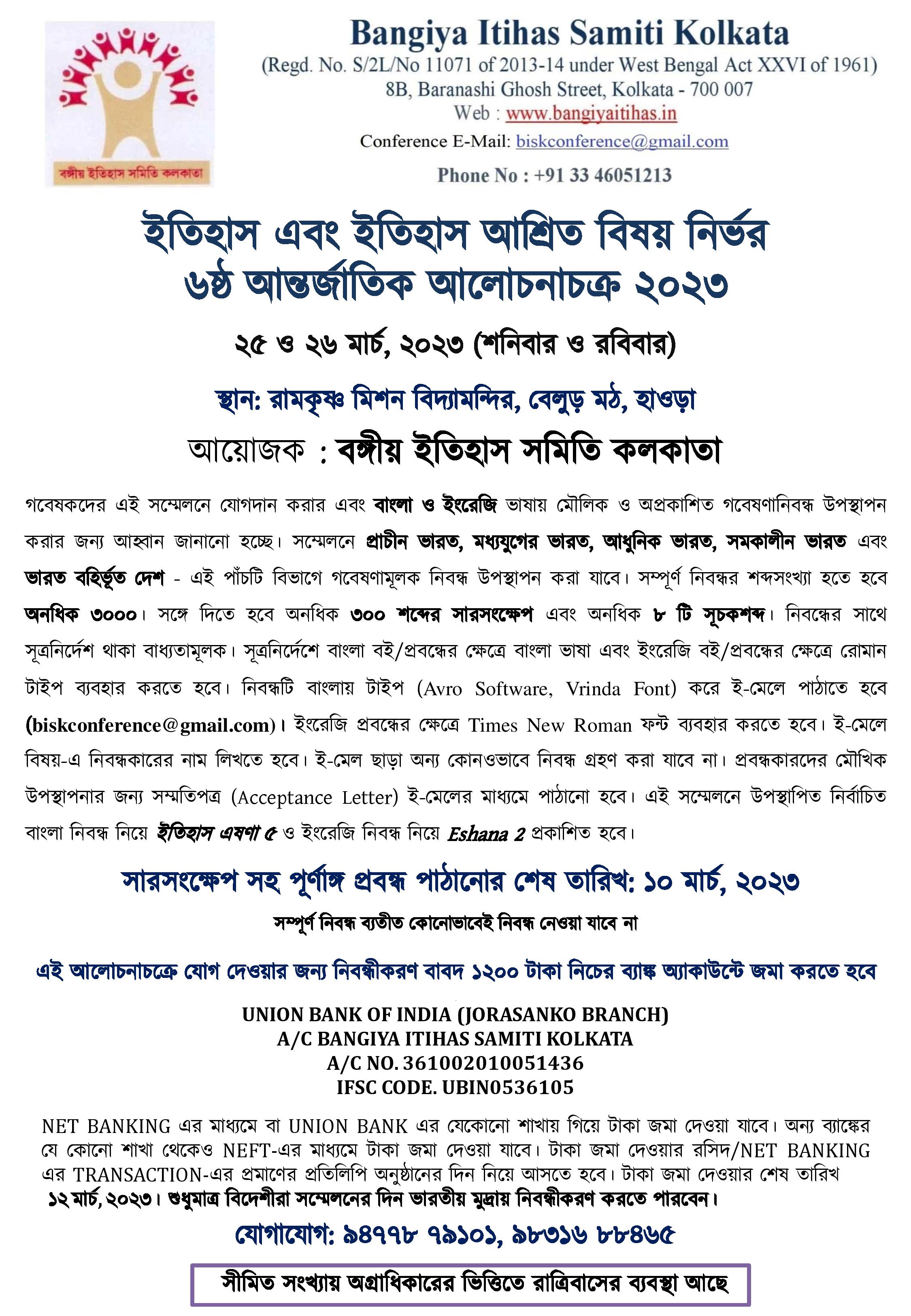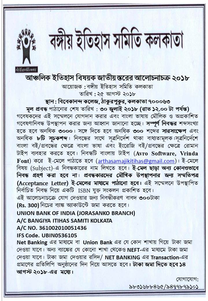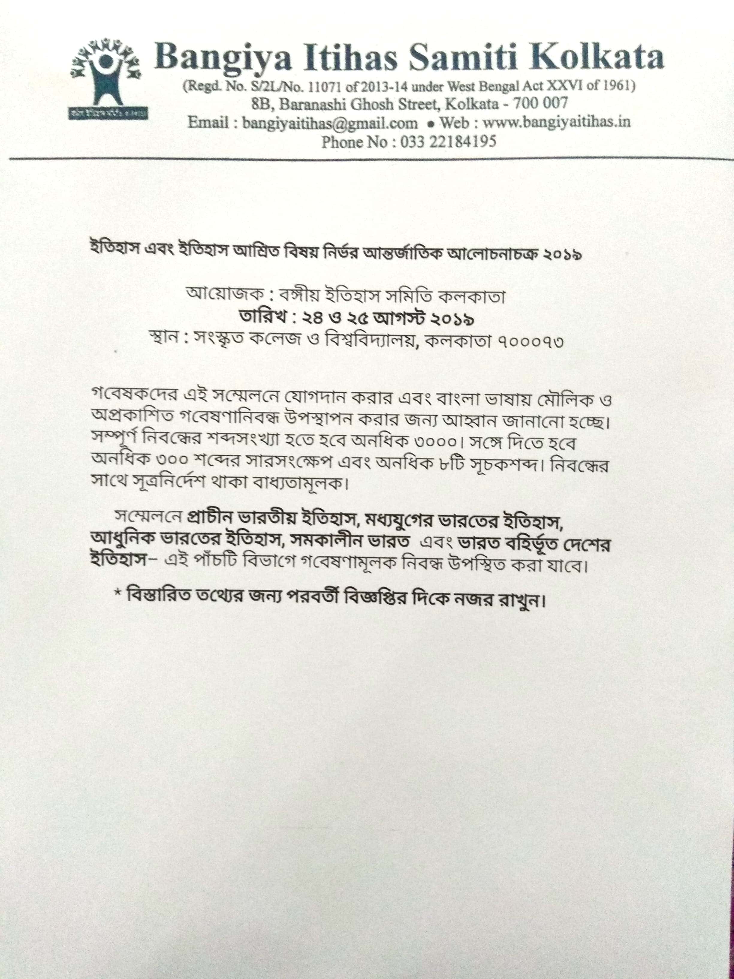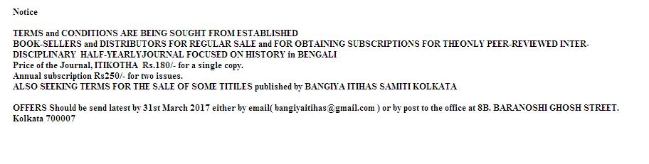 OFFERS Should be send latest by 31st March 2017 either by email( bangiyaitihas@gmail.com ) or by post to the office at 8B. BARANOSHI GHOSH STREET. Kolkata 700007