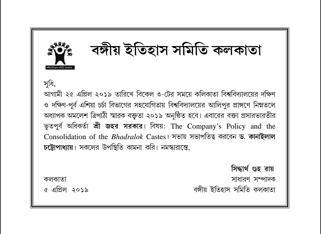 AMALESH TRIPATHI MEMORIAL LECTURE ON Modern Indian History will be delivered by Prof.RAJAT KANTA RAY, formerly Vice-Chancellor , Viswa Bharati ,Santiniketan scheduled in the late February 2017