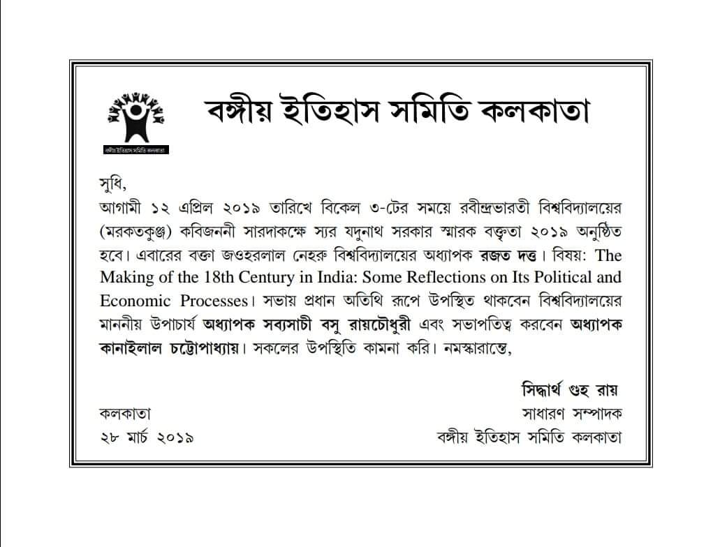 Headlines:Sir Jadunath Sarkar Memorial Lecture 2019 Date:2019-03-28
