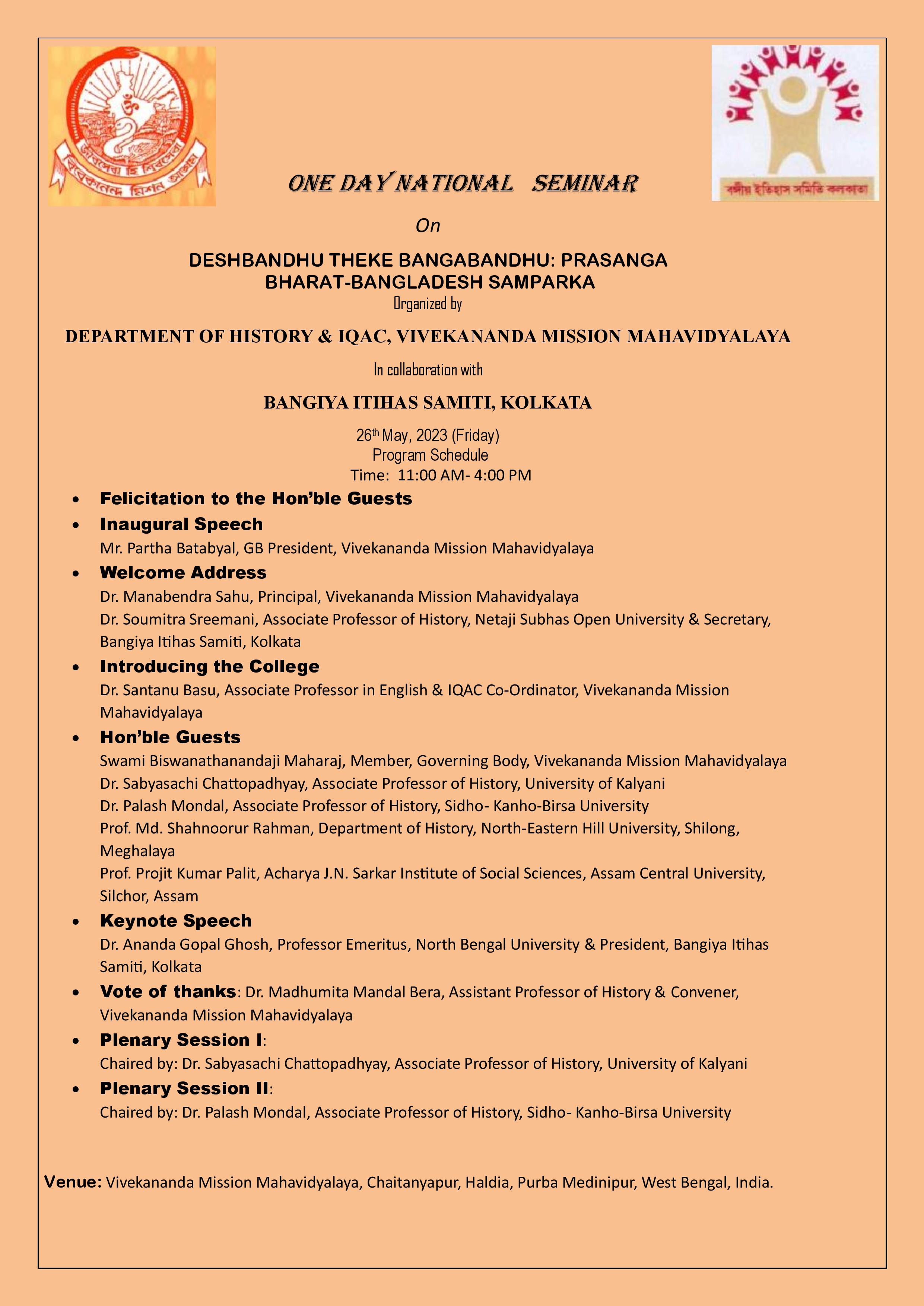 ONE DAY NATIONAL SEMINAR On DESHBANDHU THEKE BANGABANDHU: PRASANGA BHARAT-BANGLADESH SAMPARKA, VMM & BISK
